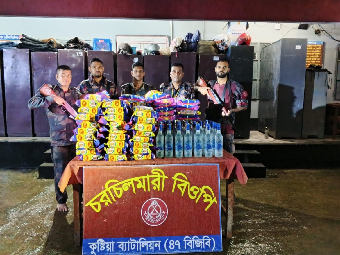 কুষ্টিয়া ব্যাটালিয়ন (৪৭ বিজিবি) এর ধারাবাহিক মাদক ও চোরাচালান বিরোধী অভিযানে ভারতীয় মদ, ফেন্সিডিল, বিপুল পরিমাণ বিড়ি, সিটি গোল্ড চেইন এবং বিষসহ বিভিন্ন পণ্য জব্দ করা হয়েছে। গত ১৬ সেপ্টেম্বর ব্যাটালিয়নের বিভিন্ন বিওপি এলাকায় পরিচালিত পৃথক অভিযানে এসব মালামাল উদ্ধার করা হয়। উদ্ধারকৃত পণ্যের মোট সিজার মূল্য প্রায় ৬ লাখ ৫ হাজার ৪২৫ টাকা ধরা হয়েছে।