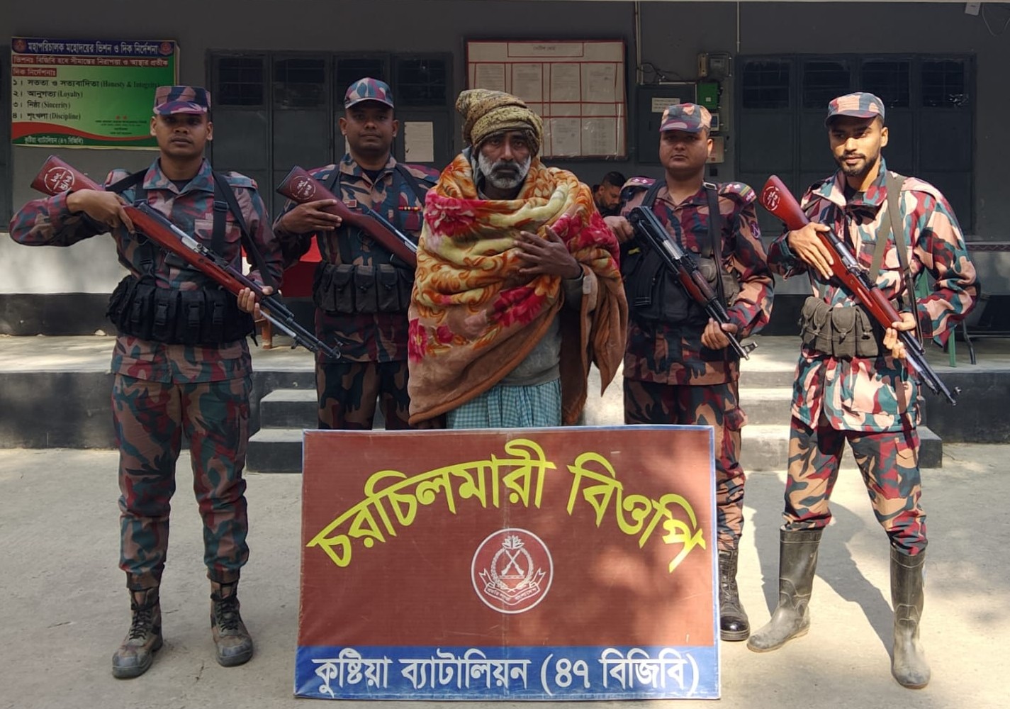 বাংলাদেশের অভ্যন্তরে অবৈধভাবে প্রবেশ কালে কুষ্টিয়া ব্যাটালিয়নের (৪৭ বিজিবি) সীমান্ত টহলে এক ভারতীয় নাগরিককে আটক করেছে বাংলাদেশ বিজিবি।  বুধবার সকালে (২৪ ডিসেম্বর)  কুষ্টিয়ার চরচিলমারী বিওপি এলাকার সীমান্ত পিলার ৮৪/১-এস থেকে প্রায় ৫০ গজ বাংলাদেশ অভ্যন্তরে প্রবেশকালে নায়েক মোঃ আসাদুজ্জামান নেতৃত্বাধীন টহল দলের সদস্যরা তাকে আটক করেন। এ সময় তার কাছে থাকা ধুরের আনুমানিক বাজার মূল্য সাত হাজার টাকা নির্ধারণ করা হয়েছে। আটক ভারতীয় নাগরিককে দৌলতপুর থানায় হস্তান্তরের প্রক্রিয়া বর্তমানে চলমান।