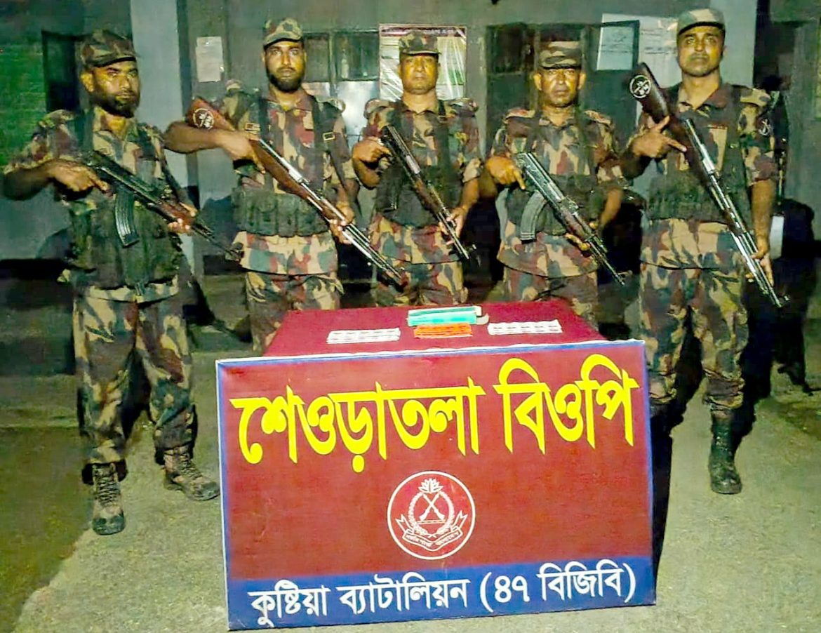 আজ বুধবার (১০ সেপ্টেম্বর) ভোর ৪টার দিকে কুষ্টিয়া ব্যাটালিয়ন (৪৭ বিজিবি)-এর শেওড়াতলা বিওপির দায়িত্বপূর্ণ সীমান্ত এলাকায় অভিযান চালানো হয়। অধিনায়ক লে. কর্নেল মো. মাহবুব মুর্শেদ রহমান, পিএসসি’র তত্ত্বাবধানে ও জেসিও-১০৮৮৪ নায়েব সুবেদার মো. নজরুল ইসলামের নেতৃত্বে পরিচালিত এ অভিযানে সীমান্ত পিলার ১৪২/২-এস থেকে প্রায় ১০০ গজ ভেতরে বর্ডারপাড়া এলাকা থেকে ১ হাজার ১০ পিস ভারতীয় সিলডিনাফিল ট্যাবলেট আটক করা হয়। জব্দকৃত ট্যাবলেটের আনুমানিক সিজার মূল্য ধরা হয়েছে ৩ লাখ ৩ হাজার টাকা। বুধবার(১০ সেপ্টেম্বর) ভোর সাড়ে ৩টার দিকে ধলা বিওপির দায়িত্বপূর্ণ এলাকায় অভিযান পরিচালনা করা হয়। সীমান্ত পিলার ১৩৬/মেইন পিলারের ২৫০ গজ ভেতরে ধলা মাঠ এলাকা থেকে হাবিলদার মো. বজলুর হকের নেতৃত্বে পরিচালিত অভিযানে ভারতীয় ১৪৮ পিস সিলডিনাফিল ট্যাবলেট ও ৬০ পিস সেনেগ্রা ট্যাবলেট আটক করা হয়। যার আনুমানিক সিজার মূল্য ৬২ হাজার টাকা।