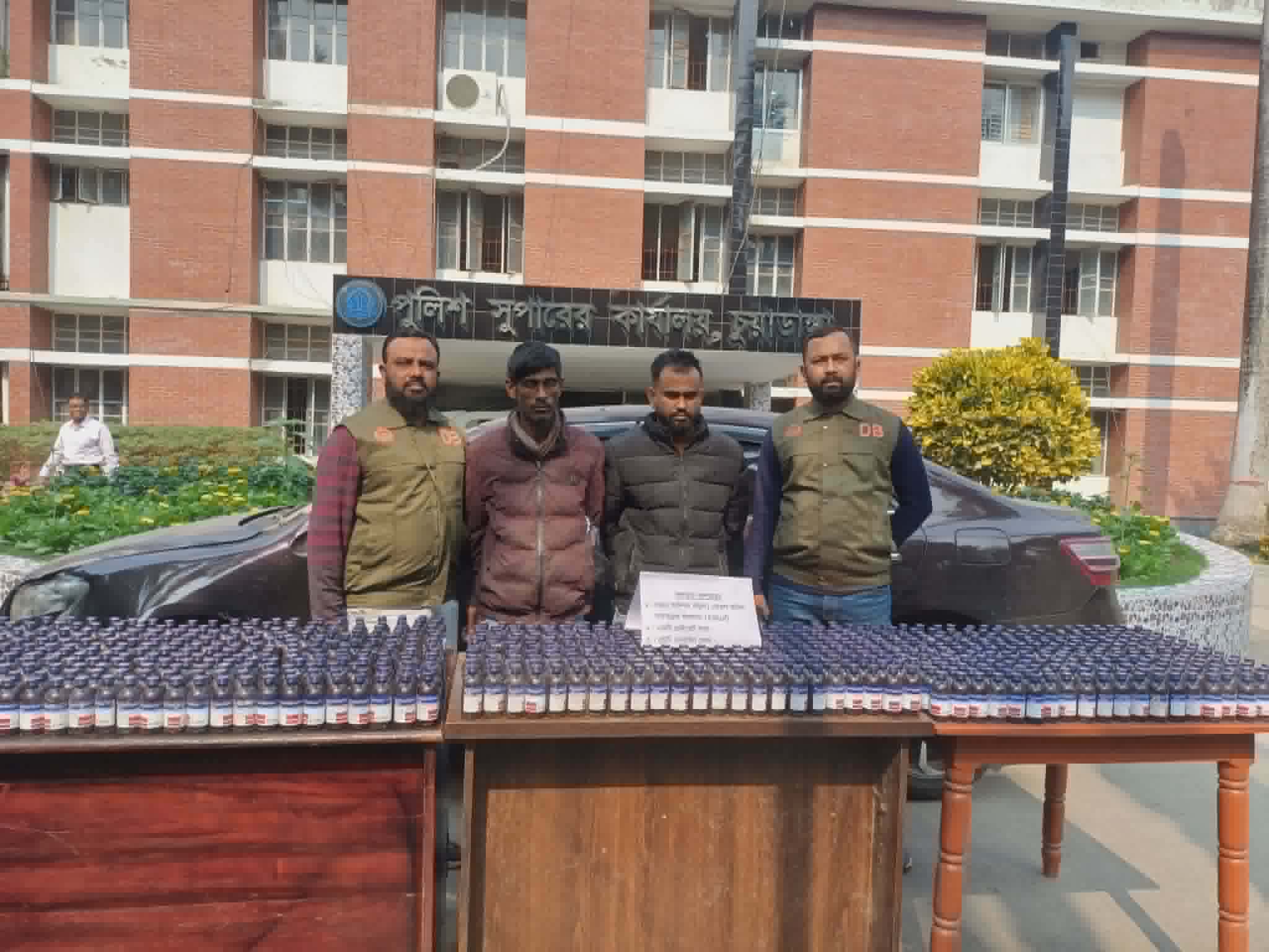 ডিবি পুলিশ জানায়, গোপন সংবাদের ভিত্তিতে ভোররাতে নাটুদাহ-জগন্নাথপুর সড়কে অভিযান চালানো হয়। পুলিশের গাড়িকে ধাক্কা দিয়ে পালানোর চেষ্টা করলেও শেষ পর্যন্ত ওই প্রাইভেট কারসহ দুজনকে আটক করা হয়। তল্লাশী চালিয়ে ৮৪০ বোতল ইসকাফ সিরাপ জব্দ করা হয়।