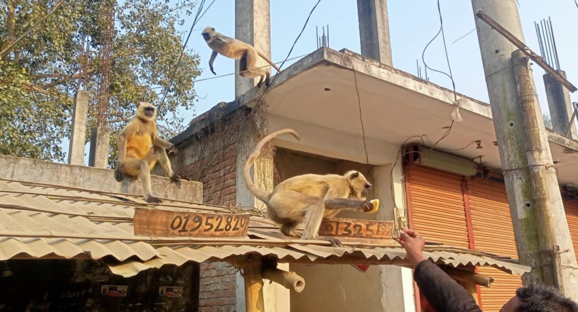 পেটের ক্ষুধায় লোকালয়ে হনুমান,হাত থেকে খাবার নিয়ে খাচ্ছে নির্ভয়ে