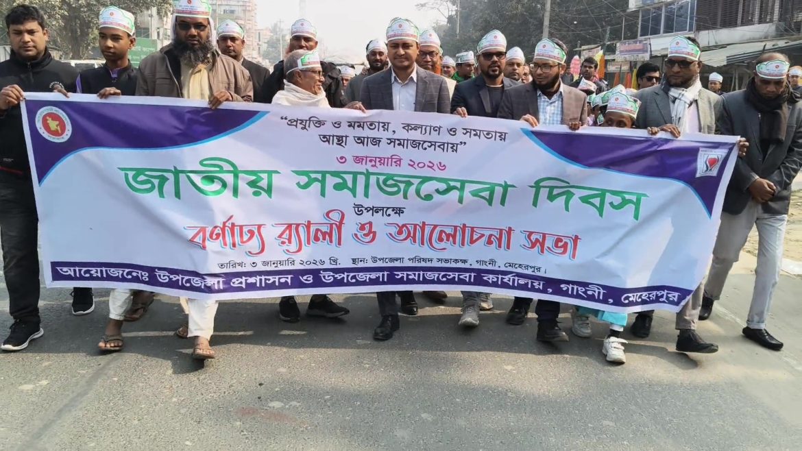“প্রযুক্তি ও মমতায়, কল্যাণ ও সমতায়”—এই প্রতিপাদ্যকে সামনে রেখে মেহেরপুরের গাংনীতে জাতীয় সমাজসেবা দিবস পালিত হয়েছে। শনিবার ( ৩ জানুয়ারি) সকালে গাংনী উপজেলা প্রশাসন ও উপজেলা সমাজসেবা কার্যালয়ের উদ্যোগে দিবসটি উপলক্ষে বর্ণাঢ্য র্যালি ও আলোচনা সভার আয়োজন করা হয়। শনিবার সকালে গাংনী উপজেলা চত্বর থেকে একটি বর্ণাঢ্য র্যালি বের হয়ে হাসপাতাল বাজার প্রদক্ষিণ শেষে পুনরায় উপজেলা চত্বরে এসে শেষ হয়। পরে উপজেলা সভাকক্ষে এক আলোচনা সভা অনুষ্ঠিত হয়।