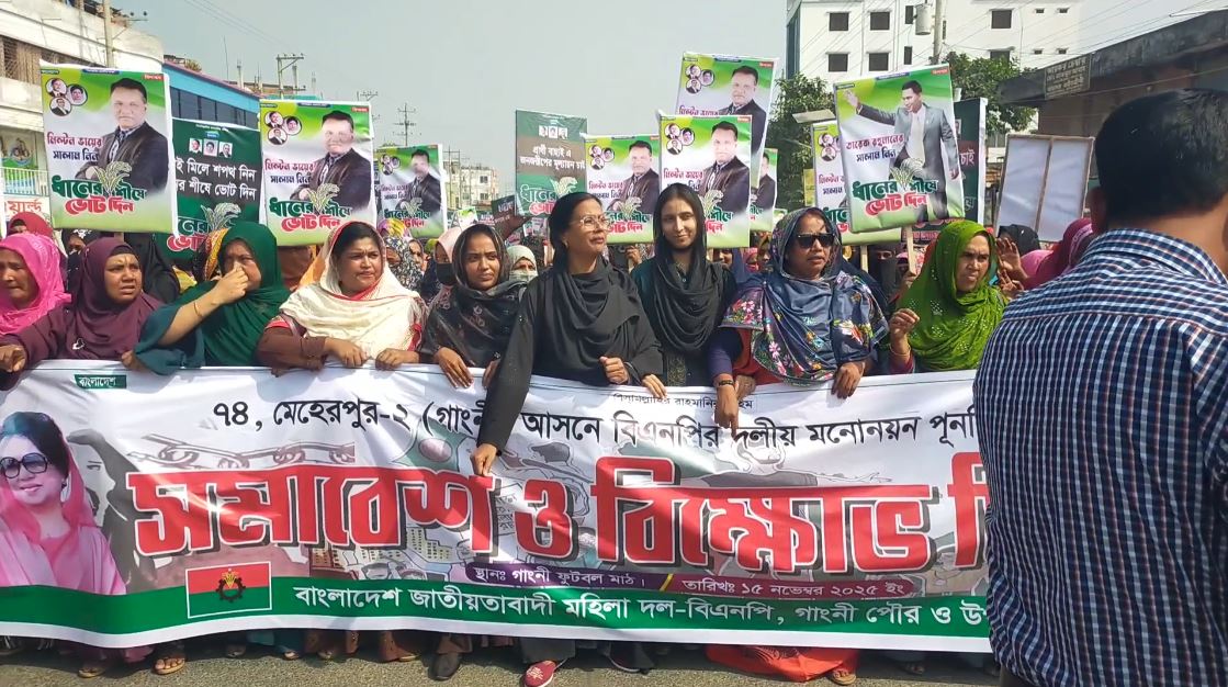 মেহেরপুর-২(গাংনী) আসনের মনোনয়ন বাতিলের দাবিতে বিক্ষোভ মিছিল ও সমাবেশ করেছে গাংনী উপজেলা জাতীয়তাবাদী মহিলা দল । শনিবার বেলা ১১ দিকে গাংনী ফুটবল মাঠ থেকে মিছিলটি বের হয়ে শহর প্রদক্ষিণ শেষে গাংনী বিএনপি অফিসে গিয়ে শেষ হয়। পরে সেখানে সংক্ষিপ্ত সমাবেশ অনুষ্ঠিত হয়।