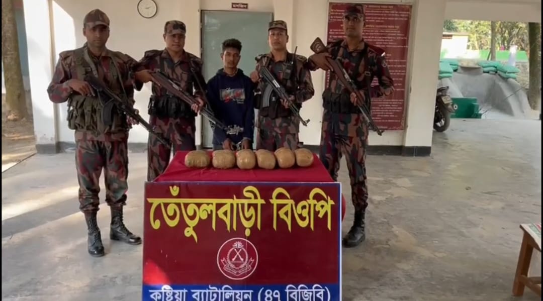 বিজিবি সূত্র জানায়, লেঃ কর্নেল রাশেদ কামাল রনি, এসইউপি, পিএসসি, জি, অধিনায়ক, কুষ্টিয়া ব্যাটালিয়ন (৪৭ বিজিবি) এর তত্ত্বাবধানে ও দিকনির্দেশনায় গাংনী উপজেলার তেঁতুলবাড়ীয়া বিওপির টহল দল কর্তৃক ১৩৮ ফোর এস সীমান্ত পিলারের ১০০ গজ বাংলাদেশ অভ্যন্তরে খাসমহল মাঠ নামক স্থানে অভিযান চালিয়ে ভারতীয় ৬ কেজি গাঁজাসহ শান্ত ইসলামকে আটক করে।
