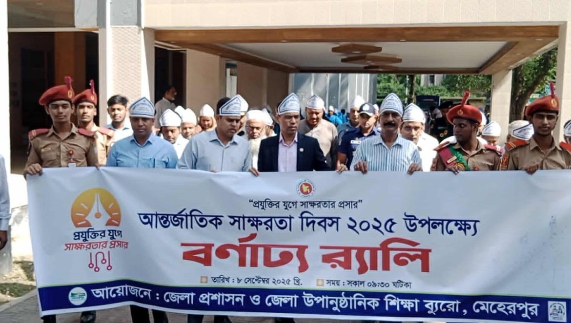 আন্তর্জাতিক সাক্ষরতা দিবস উপলক্ষে মেহেরপুরে র‍্যালি অনুষ্ঠিত হয়েছে। সোমবার সকালে মেহেরপুর জেলা প্রশাসক ড. মোহাম্মদ আবদুল ছালামের নেতৃত্বে এ র‍্যালি অনুষ্ঠিত হয়। জেলা প্রশাসন চত্তর থেকে শুরু করে র‍্যালিটি ঐ এলাকা প্রদক্ষিণ করে। র‍্যালিতে অন্যদের মধ্যে অতিরিক্ত জেলা প্রশাসক তরিকুল ইসলাম,সদর উপজেলা নির্বাহী অফিসার মোঃ খায়রুল ইসলাম, উপানুষ্ঠানিক শিক্ষা ব্যুরোর সহকারী পরিচালক সুরাজুজ্জামান, সরকারি কলেজে প্রভাষক আশরাফুল ইসলাম, ভারপ্রাপ্ত জেলা শিক্ষক অফিসার আব্দুর রাহিম, জেলা কৃষি বিপণন কর্মকর্তা তরিকুল ইসলাম, মেহেরপুর সরকারি বালিকা উচ্চ বিদ্যালয়ের শিক্ষক সেকেন্দার আলী সহ বিভিন্ন প্রতিষ্ঠানের ছেলেমেয়েরা র‍্যালি অংশগ্রহণ করেন।