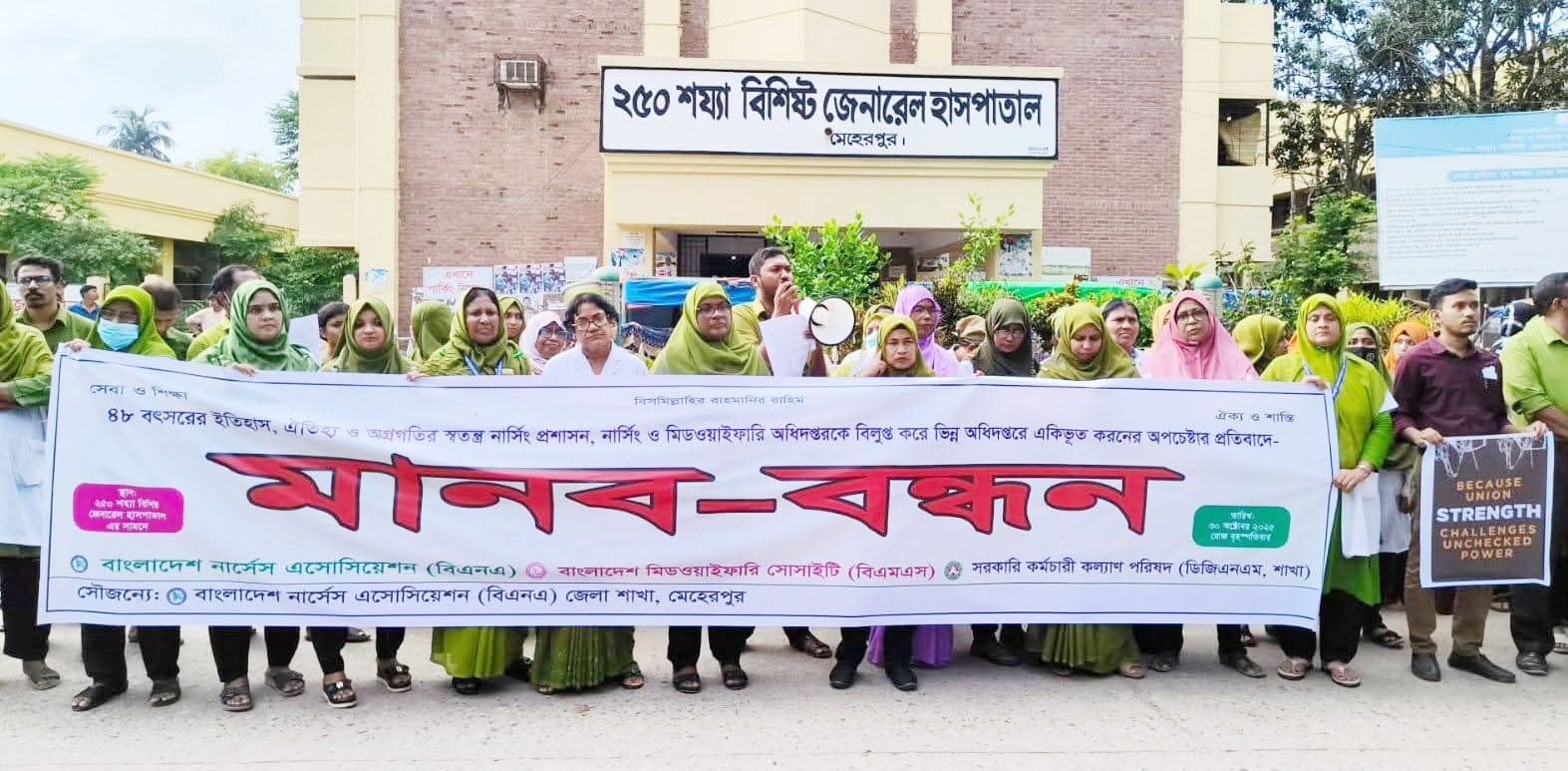 ঐতিহ্য ও অগ্রগতির স্বতন্ত্র নার্সিং প্রশাসন, নার্সিং ও মিডওয়াইফারি অধিদপ্তরকে বিলুপ্ত করে ভিন্ন অধিদপ্তরে একিভূত করনের অপচেষ্টার প্রতিবাদে মেহেরপুরে মানববন্ধন করেছে নাসিং কর্মকর্তারা। বৃহস্পতিবার দুপুরে মেহেরপুর জেনারেল হাসপাতালের সামনে এ মানববন্ধন অনুষ্ঠিত হয়। মানববন্ধনে সভাপতিত্ব করেন বাংলাদেশ নার্সেস এসোসিয়েশন (বিএনএ) মেহেরপুর জেলা শাখার সভাপতি চামিলি ইয়াসমিন।