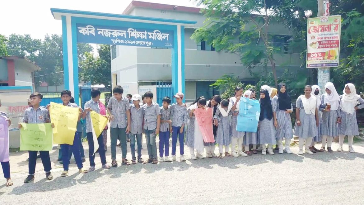 মেহেরপুরে কবি নজরুল শিক্ষা মঞ্জিল মাধ্যমিক বিদ্যালয়ের প্রধান শিক্ষক সানজিদা ইসলামের অনিয়ম ও দুর্নীতির বিচার চেয়ে ছয় দফা দাবীতে মানববন্ধন করেছে শিক্ষার্থীরা।