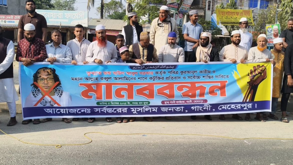 বাউল আবুল সরকার কর্তৃক পবিত্র কুরআনুল কারীম ও মহান আল্লাহ্ রব্বুল আলামিনের শানে কটূক্তির প্রতিবাদে এবং তাঁর দৃষ্টান্তমূলক শাস্তির দাবিতে মেহেরপুরের গাংনীতে মানববন্ধন অনুষ্ঠিত হয়েছে। শুক্রবার জুম্মার নামাজ শেষে শহীদ আবু সাঈদ চত্বরে এ মানববন্ধনে বিপুলসংখ্যক মানুষ অংশগ্রহণ করেন। মানববন্ধন আয়োজন করে গাংনীর সর্বস্তরের মুসলিম জনতা।