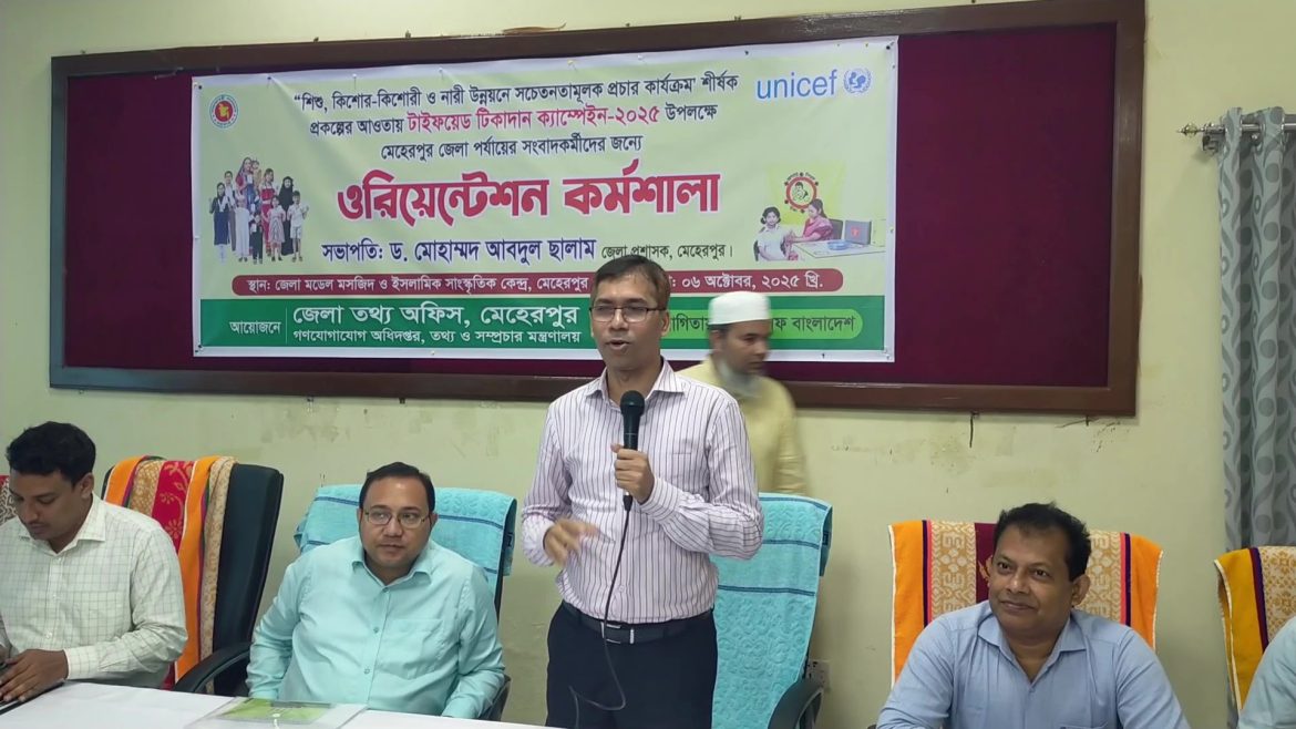 শিশু, কিশোর ও নারী উন্নয়নে সচেতনতামূলক প্রচার কার্যক্রম শীর্ষক প্রকল্পের আওতায় ‘টাইফয়েড টিকাদান ক্যাম্পেইন ২০২৫’ উপলক্ষে জেলা পর্যায়ের সাংবাদিকদের জন্য এক ওরিয়েন্টেশন কর্মশালা অনুষ্ঠিত হয়েছে। সোমবার সকাল সাড়ে ১০টার দিকে মেহেরপুর ইসলামিক ফাউন্ডেশনের সভাকক্ষে এ কর্মশালার আয়োজন করা হয়।