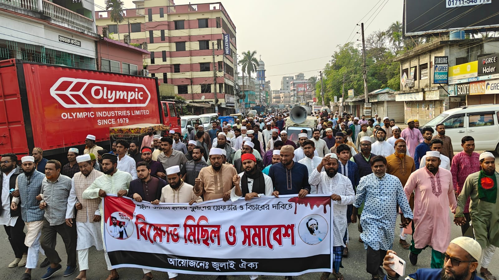 শহীদ ওসমান হাদীর হত্যাকারীদের গ্রেপ্তার ও বিচারের দাবিতে জুলাই ঐক্য পরিষদের ব্যানারে বিক্ষোভ মিছিল অনুষ্ঠিত হয়েছে।