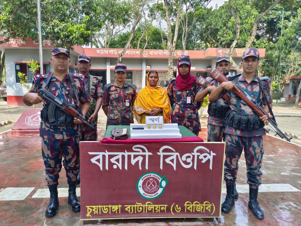 বিজিবি ৬ ব্যাটালিয়নের অধিনায়ক লে. কর্নেল মো. নাজমুল হাসান জানান, বিশেষ গোয়েন্দা তথ্যের ভিত্তিতে জানা যায় কামারপাড়া সীমান্ত দিয়ে স্বর্ণ ভারতে পাচার করা হবে। এ তথ্যের ভিত্তিতে বারাদী বিওপির একটি বিশেষ টহল দল অভিযান চালিয়ে সীমান্ত পিলার ৮০/১০-আর হতে প্রায় ৮০০ গজ অভ্যন্তরে কামারপাড়া পাকা সড়ক থেকে মোছা. আসমা (২৫) নামে এক নারীকে আটক করে। তিনি ওই গ্রামের ওয়াসিমের স্ত্রী। এ সময় তার কাছ থেকে তিনটি স্বর্ণবার, একটি বাটন মোবাইল ফোন ও নগদ ১৮০ টাকা উদ্ধার করা হয়। জব্দ করা স্বর্ণবারগুলোর মোট ওজন ৩৫৪ গ্রাম, যার বাজারমূল্য প্রায় ৫৮ লাখ ৫৮ হাজার ৭৫৬ টাকা।